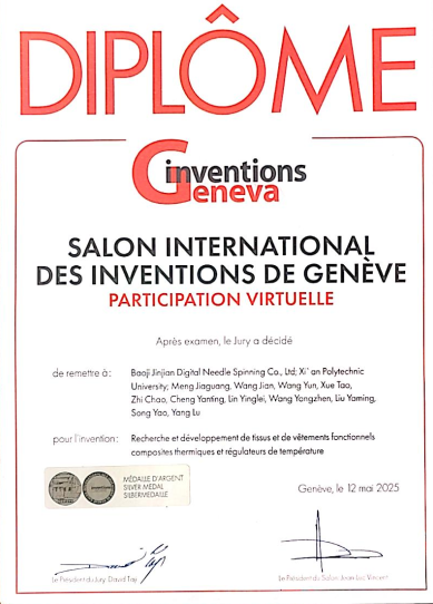 近日,全球久负盛名的第50届日内瓦国际发明展在瑞士举办。由公司孟家光教授科研团队与宝鸡金健数码针纺有限责任公司合作完成的发明成果“一种发热调温复合功能性面料与服装生产技术及产品”,从全球近40个国家与地区近2000项尖端发明中强势突围,荣获日内瓦国际发明展银奖。