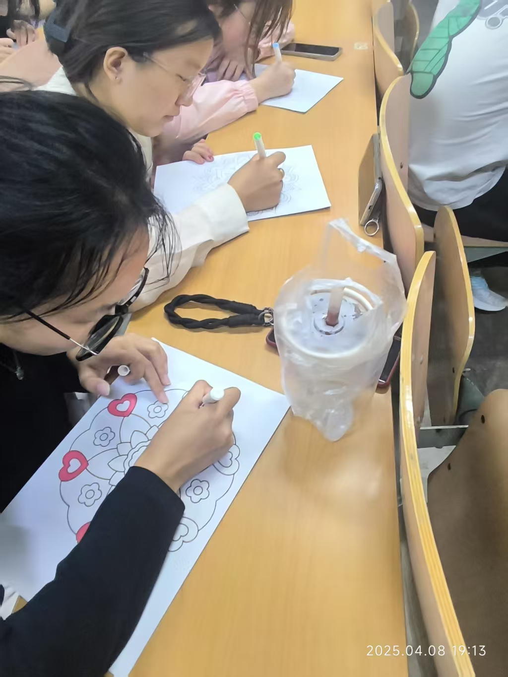 在安静舒适的氛围中,同学们围坐一圈,开始了自由创作。他们专注地在纸上描绘线条与图案,选用不同色彩表达此刻的情绪状态。一幅幅曼陀罗作品在画纸上逐渐成形,或对称,或流动,或张扬,或内敛,每一笔都承载着情感的释放与心灵的梳理。