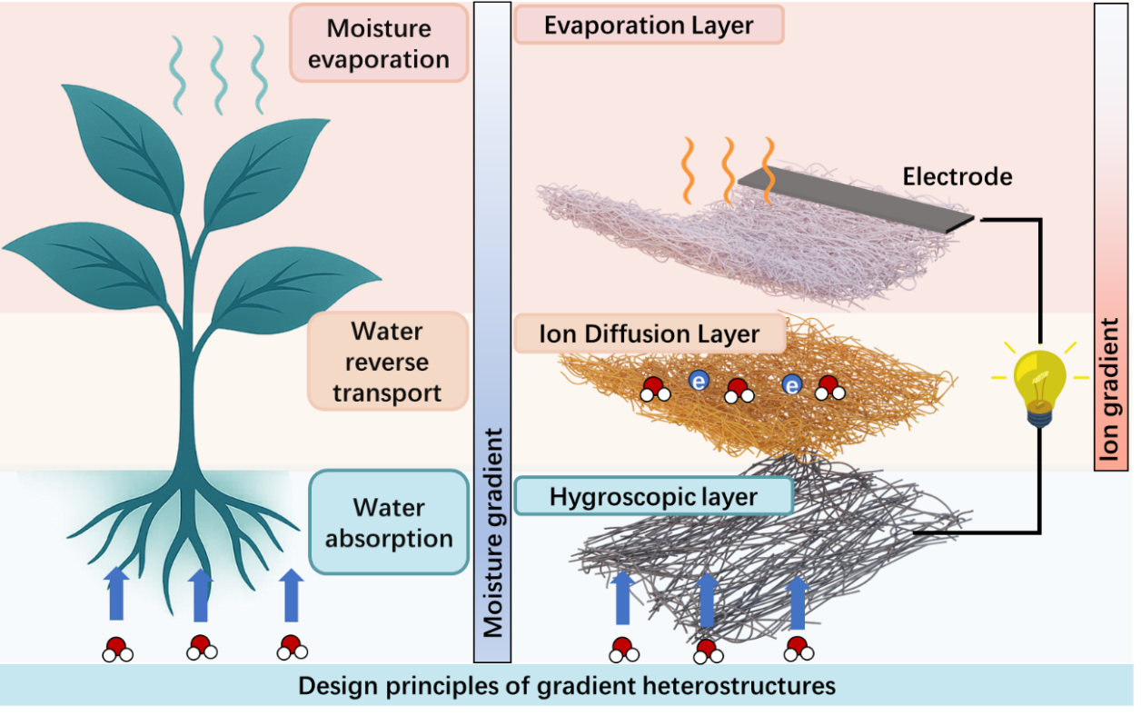 人体皮肤每小时可通过出汗散失约40-340 W热能,人体自身的水汽循环可以为可穿戴器件提供持续而丰富的能量。然而,现有湿热发电装置存在吸湿饱和快、离子迁移不稳定、输出功率不足等问题,难以满足动态可穿戴应用需求。因此,实现稳定捕获水汽,定向传输和高效电荷分离,成为该领域亟需突破的关键科学问题。