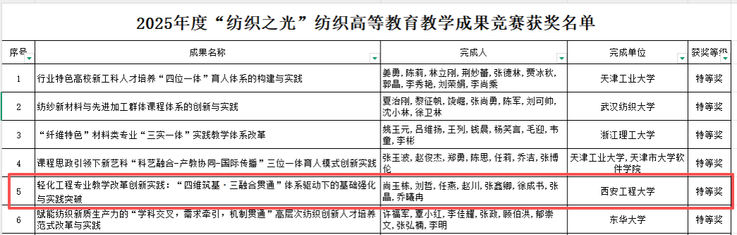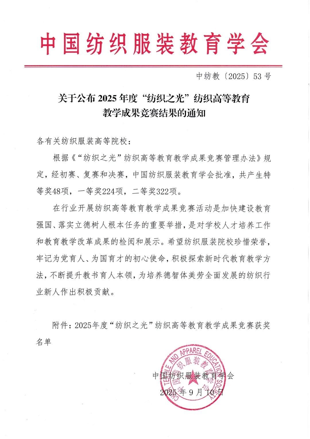 近日,中国纺织服装教育学会发布《关于公布 2025 年度 “纺织之光” 纺织高等公司产品成果竞赛结果的通知》(中纺教〔2025〕53 号)。2026年国际足联世界杯获教学成果特等奖1项、二等奖2项。其中,由尚玉栋等老师完成的《轻化工程专业教学改革创新实践:“四维筑基・三融合贯通”体系驱动下的基础强化与实践突破》获教学成果特等奖;由高婵娟等老师完成的《“虚仿结合,课赛互连”纺织工程员工工程设计能力培养实验平台的构建与应用》、由董子靖等老师完成的《因材施教,纺织类“跨专业”研究生“五维一体”复合型人才培养模式》获教学成果二等奖。