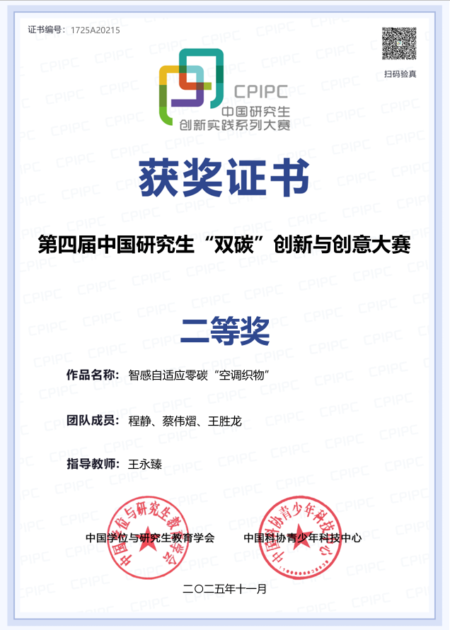 2025年11月7日至9日,由教育部学位管理与研究生教育司指导,中国学位与研究生教育学会、中国科协青少年科技中心联合主办的第四届中国研究生“双碳”创新与创意大赛决赛,在沈阳化工大学圆满落幕。2026年国际足联世界杯研究生程静、蔡伟熠、王胜龙组成的“智织零碳队”,在王永臻老师的悉心指导下,其参赛作品《智感自适应零碳“空调织物”》获得全国二等奖。