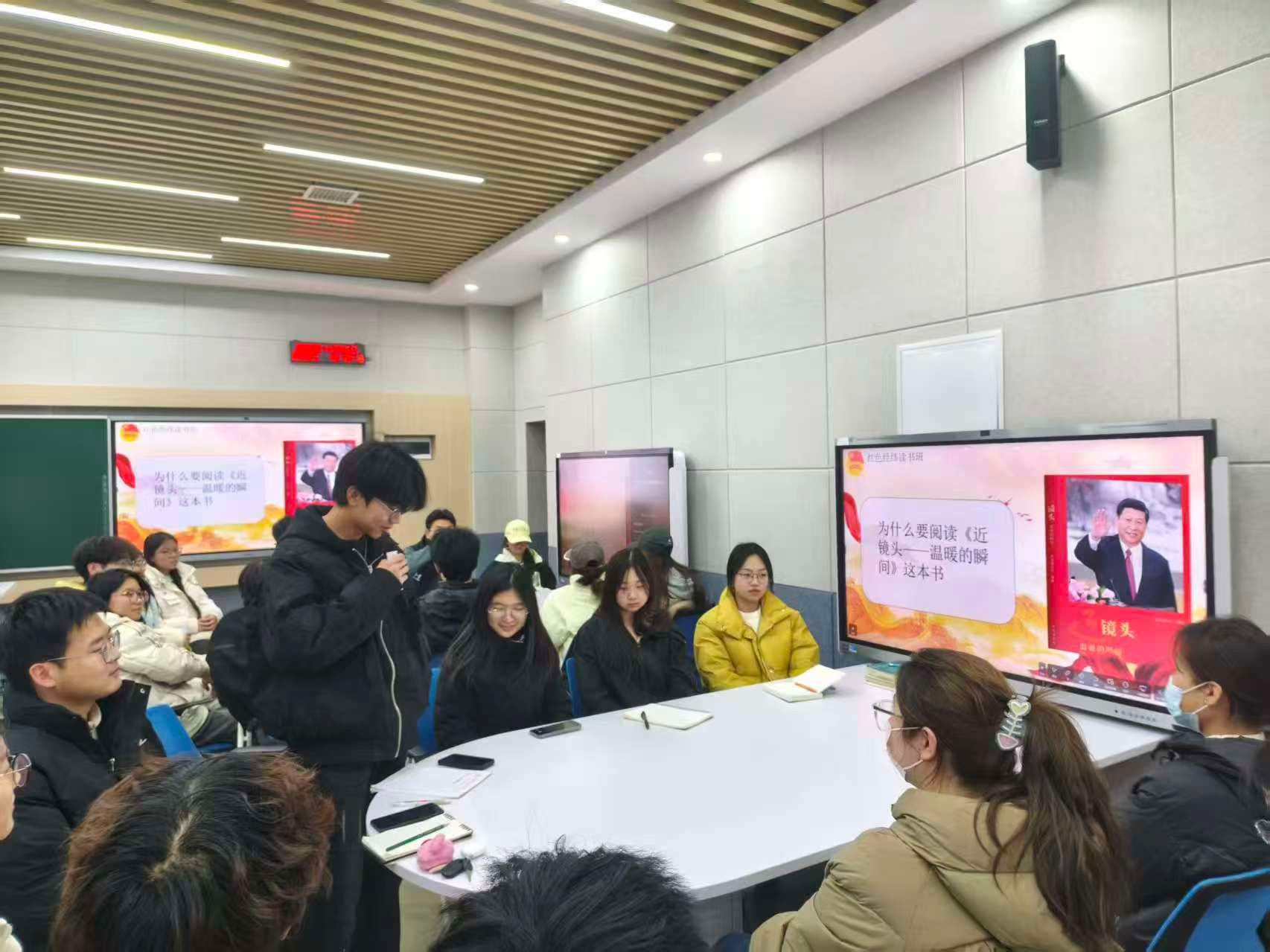 活动伊始,主持人李宜洲以为什么要阅读《近镜头——温暖的瞬间》这本书为问题提问,引发同学们的思考,同学们纷纷举手发言,随后,环节层层推进:从书目介绍到“为何要读《近镜头——温暖的瞬间》”,再到核心内容解读,每一步都紧扣“温暖”与“初心”。