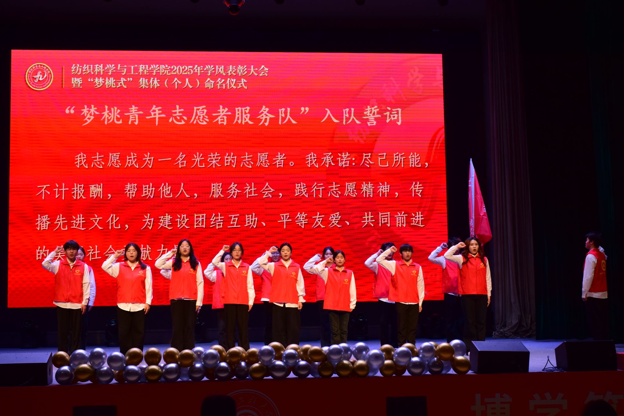 榜样的力量催人奋进,精神的传承生生不息。在表彰分享环节结束后,“梦桃青年志愿者服务队”新队员入队仪式紧接着举行,10余名新队员代表高举右拳,庄严宣誓,立志传承赵梦桃的优良作风,在志愿服务中绽放青春光彩。队旗挥舞,掌声如潮,象征着“梦桃精神”代代相传、生生不息。