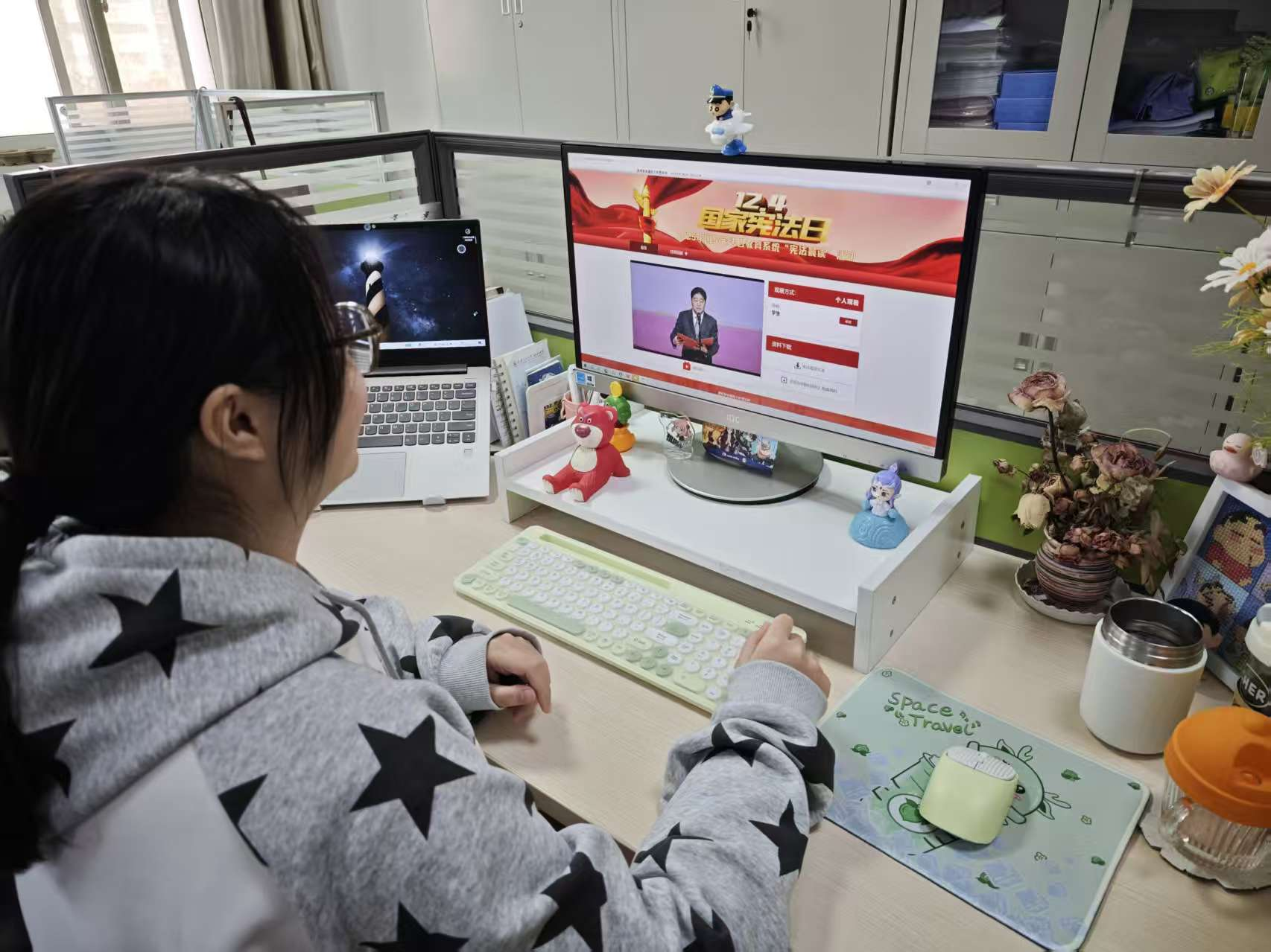 公司党政领导班子成员在纺织楼404会议室集中观看活动直播,进一步增强带头学法、示范普法的责任意识。本硕博员工代表在金花校区3号教学楼407室集中观看直播,现场学习氛围浓厚、秩序井然。公司其他员工则通过电脑、手机等终端设备,在宿舍、研究生工作室等场地线上同步参与学习,实现活动全覆盖。