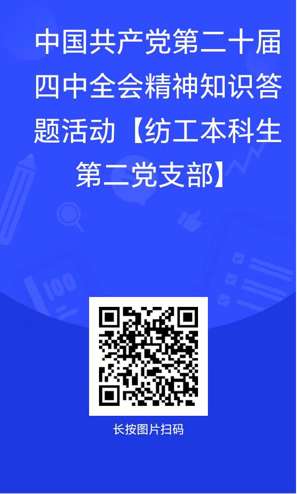 为深入学习贯彻党的二十届四中全会精神,推动支部理论学习常态化、制度化,引导党员及入党积极分子把思想和行动统一到党中央重大决策部署上来,3月27日至29日,纺织工程本科生第二党支部精心组织开展党的二十届四中全会精神线上知识答题活动,支部全体党员全员参与,部分非党员同学自愿加入,以线上答题形式掀起学习全会精神的热潮。