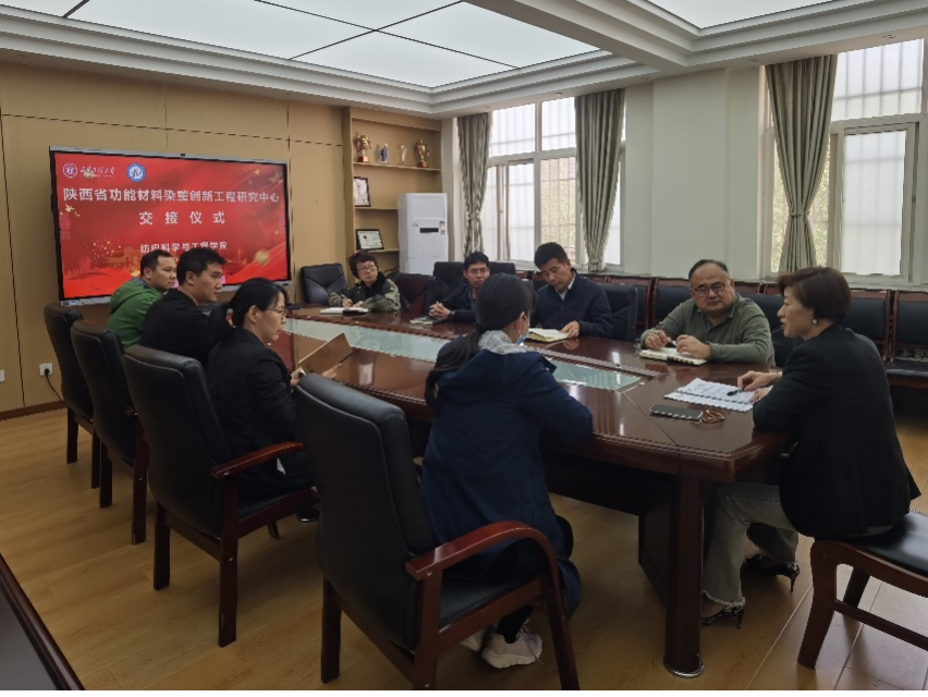 2026年4月10日下午,在公司404会议室举行了陕西省功能材料染整创新工程中心交接仪式。会议由科研院王卫副经理主持,纺织公司刘哲副经理(主持工作)、张鹏飞副经理、陕西省功能材料染整创新工程中心原主任谭艳君教授、陕西省功能材料染整创新工程中心新任主任徐成书教授及团队成员出席了交接仪式。