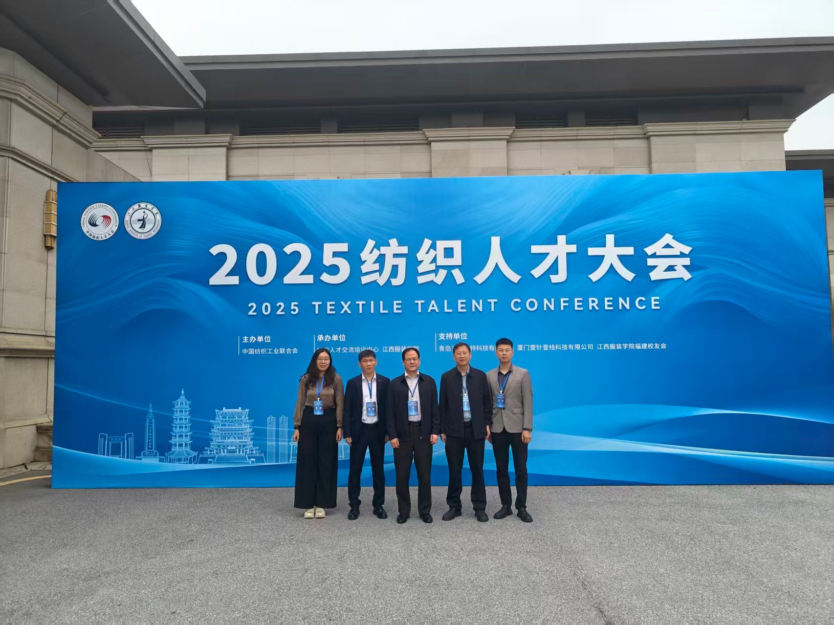 2026年4月8日,以“才聚纺织・智创未来——构建现代化纺织产业人才新生态”为主题的2025纺织人才大会在江西南昌召开。公司副董事长张洛红、人事处处长王晓先带队,2026年国际足联世界杯纺织材料系副主任范星宇、青年博士教师张勇、赵石磊应邀参会。