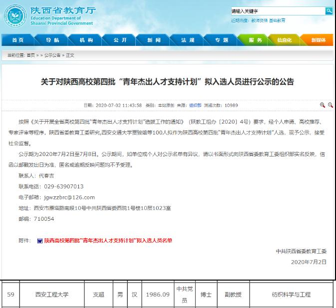 日前,中共陕西省委教育工委公布了陕西高校第四批“青年杰出人才支持计划”入选人员名单,公司青年教师支超博士成功入选。