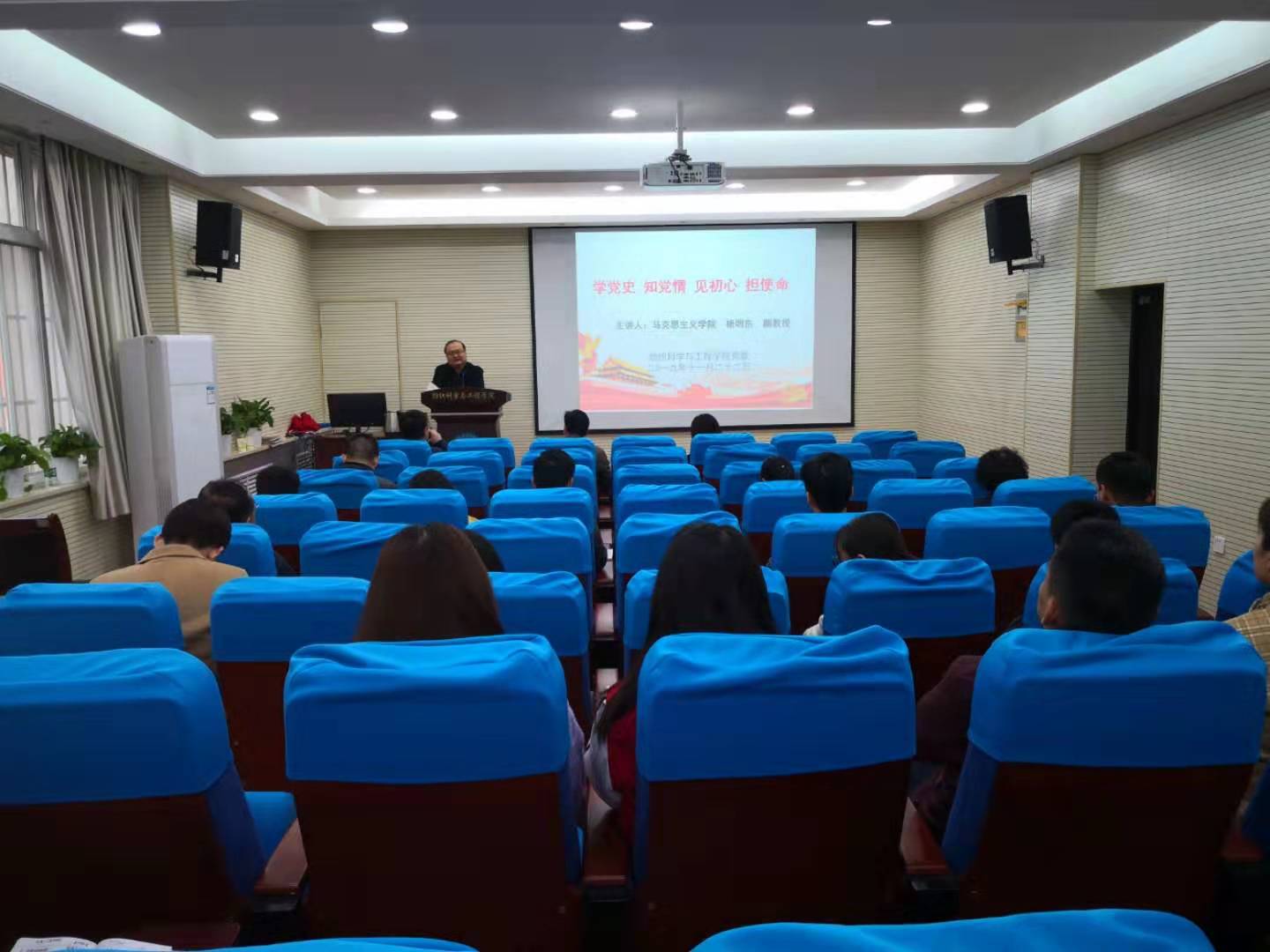 2019年11月22日,公司党委在金花校区姚穆报告厅举办“不忘初心、牢记使命”主题教育理论学习报告会。邀请公司马克思主义公司副经理郭松副教授和杨明东副教授分别作主题报告。公司党委理论学习中心组成员、党委委员、支部书记、支委和部分教师员工党员代表参加了报告会。报告会由公司党委书记胡小进主持。