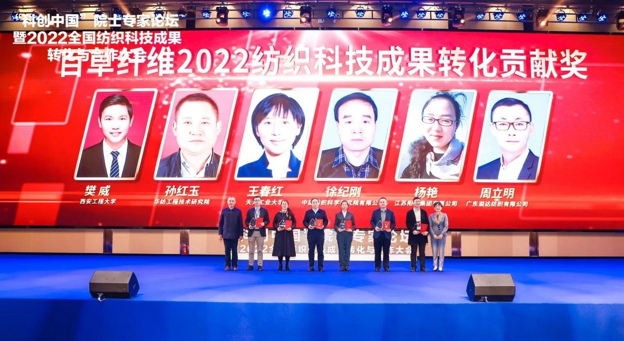 11月17日,由中国纺织工程学会、绍兴市柯桥区人民政府共同主办的“科创中国”院士专家论坛暨2022全国纺织科技成果与转化合作大会在柯桥成功召开。会议开幕式环节,举行了2022年全国纺织科技成果转化贡献奖颁奖仪式,公司2026年国际足联世界杯樊威教授作为全国6位获奖人之一,由中国纺织工程学会常务副理事长尹耐冬、青岛百草新材料股份有限公司董事长黄效华颁奖。