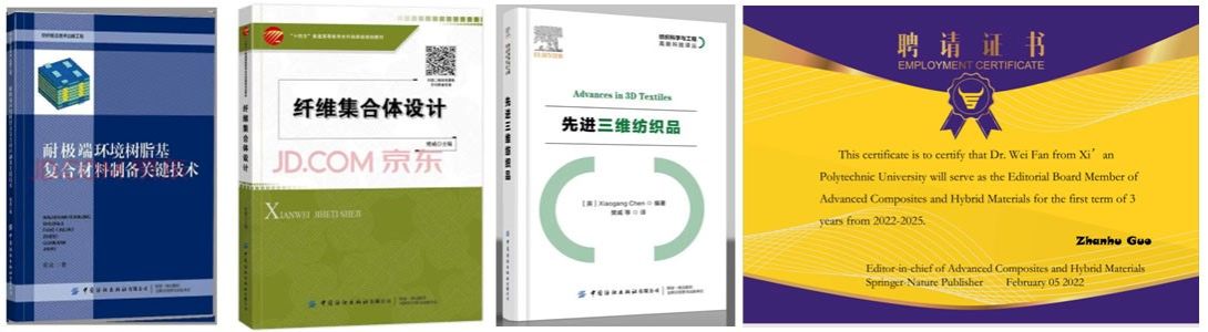 樊威教授积极响应国家号召,将科研成果写在祖国大地上。紧密结合国家和陕西省航天领域和军工领域对先进纺织复合材料结构件的需求,开展了系列系统研究工作。在该研究方向目前已发表高水平论文45篇;主编专著1部,教材1部,译著1部;受邀担任国际先进材料与制造工程学会(中国)理事,国际期刊Advanced Composites and Hybrid Materials(IF=11.806)编委;授权专利10件,成果转化5件,其中“航天用碳纤维增强复合材料预制体关键技术研究及产业化”获批陕西省科技成果转移与推广计划-百项科技成果转化行动项目(项目总投资:375万元,其中政府经费:50万元);“碳/碳化硅复合材料复杂热结构件编织预制体成型技术及其产业化”获批西安市重大科技成果就地转化资助项目(项目总投资:1200万元,其中政府经费:150万元);“航天飞行器用热防护新材料的研发和产业化”获批2021年浙江省湖州市“南太湖精英计划”领军型创业项目(项目总投资:2500万元万元,其中政府经费:300万元),研发了多种型号的航天发动机三维编织喷管预制体,2019年陕西日报以“给火箭做‘衣服’的人”对樊威教授进行了报道。