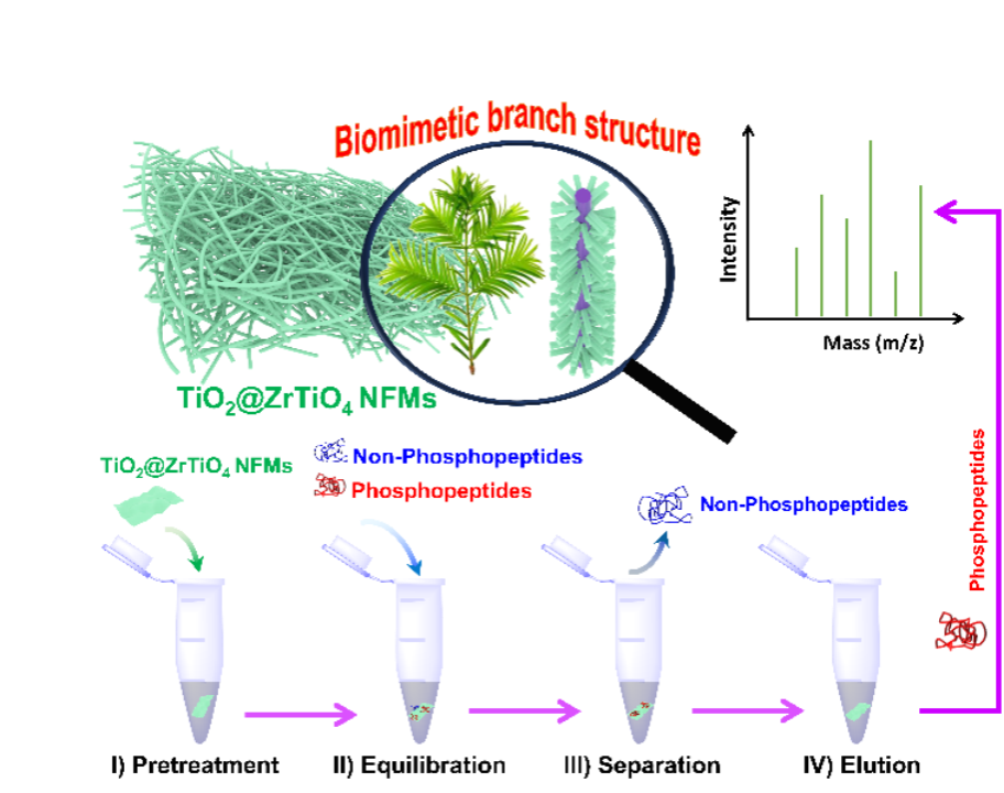 随着人口老龄化加剧,癌症发病率逐年攀升,对癌症的防治任务异常艰巨,癌症作为一种复杂的多因素疾病,富集并分析癌细胞内部的特异性磷酸化蛋白,有望阐明诱发癌症的分子机制,为后续开发新型癌症疗法提供可靠的理论依据。为此,课题组将静电纺丝技术与原位水热合成修饰技术结合开发了仿根毛/叶脉结构纳米纤维磷酸化肽富集膜,该仿生纳米纤维膜对宫颈癌细胞中磷酸化肽的富集能力和特异性磷酸化蛋白的鉴别能力超过商品化TiO2颗粒,该项研究为研究癌症分子机制和新型生物药研发提供一定的理论信息参考。该方向代表性论文发表在国际知名期刊《Nano Research》上,论文链接:https://doi.org/10.1007/s12274-023-6277-7