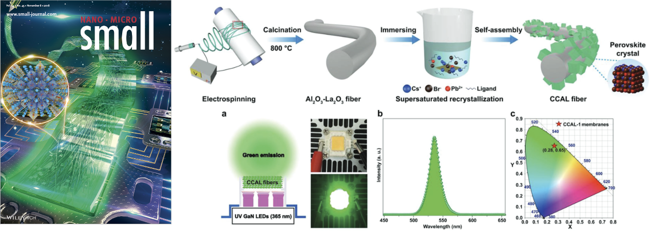 粉末态无机发光材料在使用过程中不但需经过注塑、涂覆、封装等复杂工艺得以应用,而且极易造成发光亮度降低、均匀性差等性能缺陷,这极大的限制了其在照明、激光、防伪和生物医学等领域的实际应用。为此,课题组通过简易方法制备了可自支撑的无机纳米纤维发光材料,该纤维膜可组装开发色标级发光器件,该项研究将为照明和背光显示行业的柔性无机发光材料开辟新途径。该方向代表性论文发表在国际知名期刊《Small》上,并被评选为封面论文,论文链接:https://onlinelibrary.wiley.com/doi/10.1002/smll.201801963
