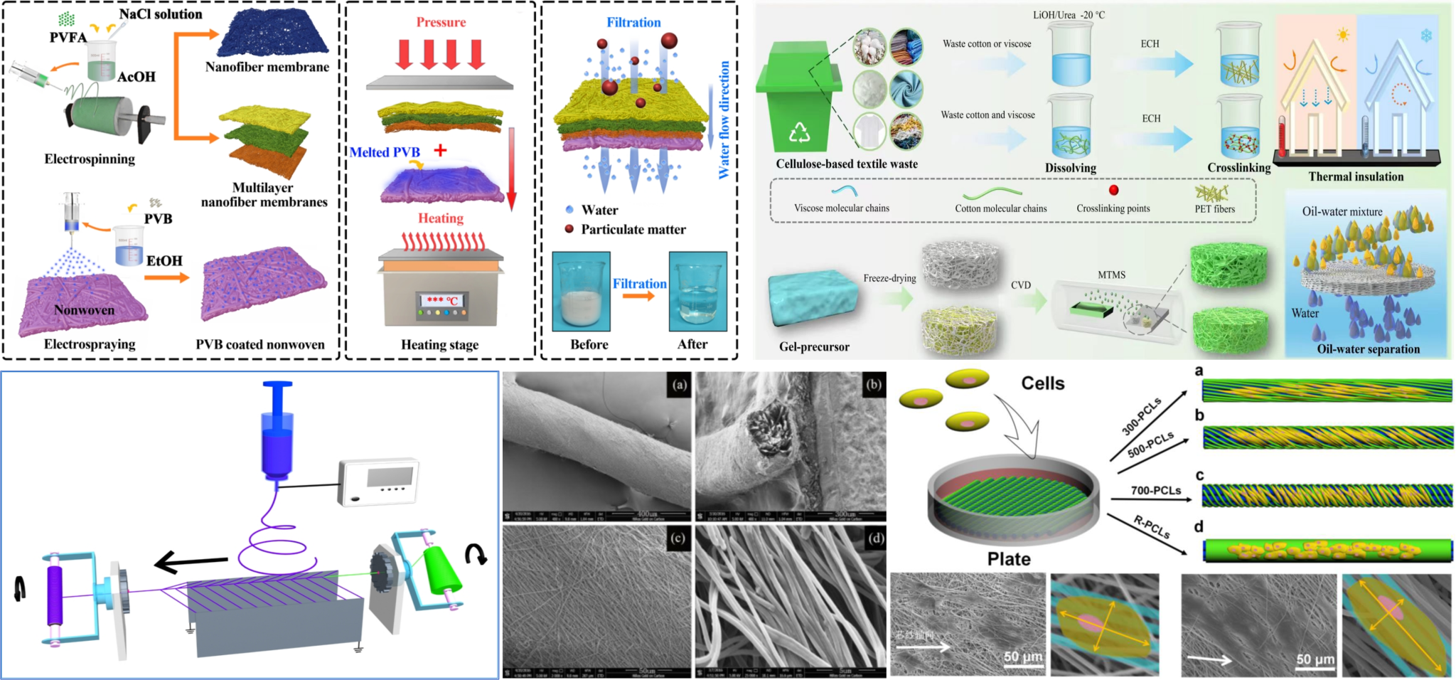 利用废旧纺织品等作为原料,借助静电纺丝,或与电喷组合,以及借助冷冻干燥等工艺技术,制备一维微纳米纤维束/纱、二维均匀微纳米纤维网和三维微纳米纤维块或气凝胶等微纳米纤维集合体结构,并将其和传统微米级纺织材料复合,或利用传统纺织加工手段,构造各类多级结构制品,同时寻求在空气/水过滤、生物医用等领域的应用。