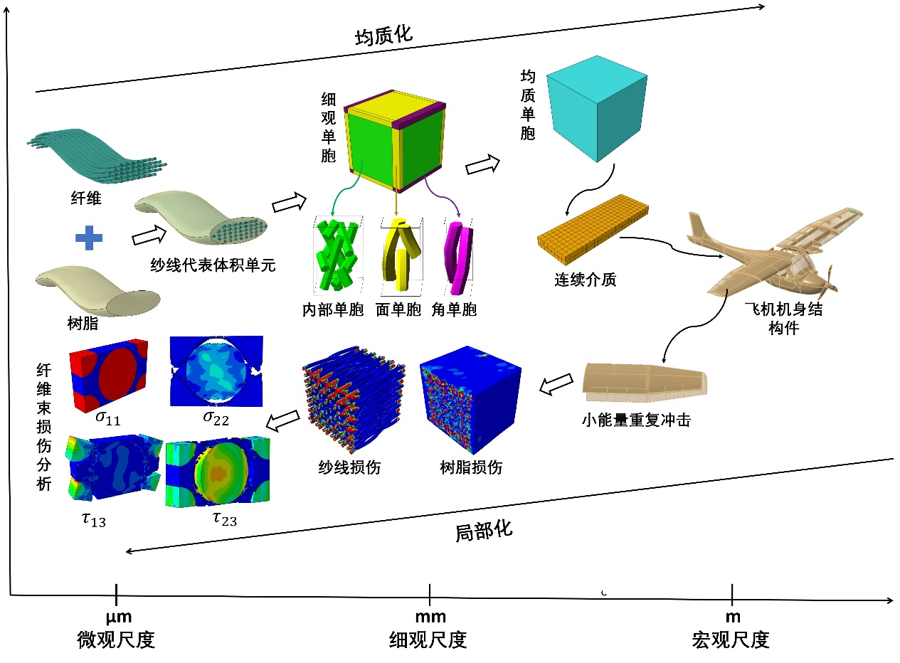 以三维编织复合材料航空航天领域应用为背景,建立复合材料多尺度模型,模拟复合材料冲击载荷下动态失效过程,探究材料不同尺度失效机理,实现材料强度的细观结构优化设计。