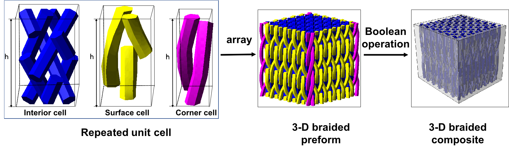 模拟三维编织等成型过程,探究织造参数对三维预成型体尺寸、形状、张力和损伤影响机理。